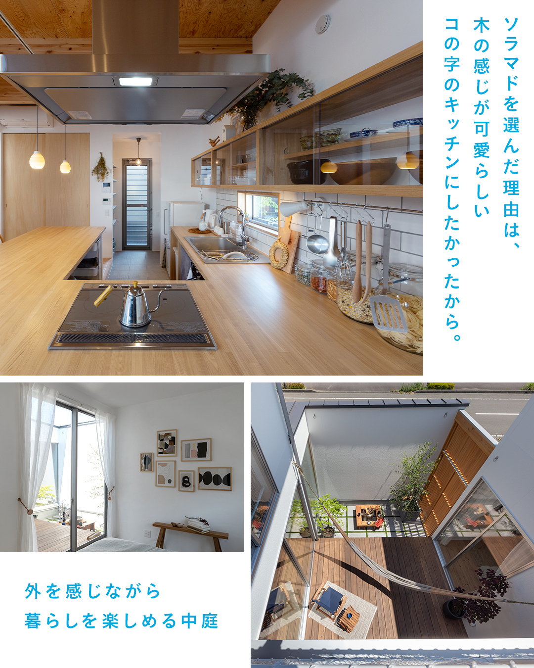家の中心にはコの字型キッチンとソラマドデッキ(中庭)、