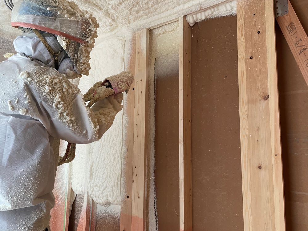 外壁と屋根の室内側に断熱材を吹付ました!