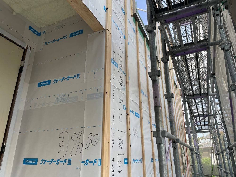 この後から外壁材を張っていきます。