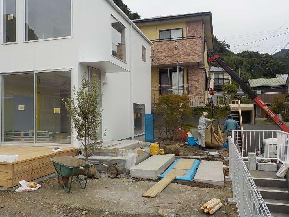 階段を上がって玄関に続くアプローチ部分と、庭の芝張り、植栽工事を行いました。