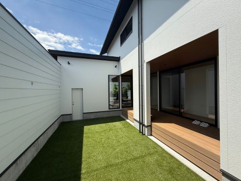 バレーボールが楽しめる広い中庭と、家庭菜園が楽しめるお庭のあるお家。